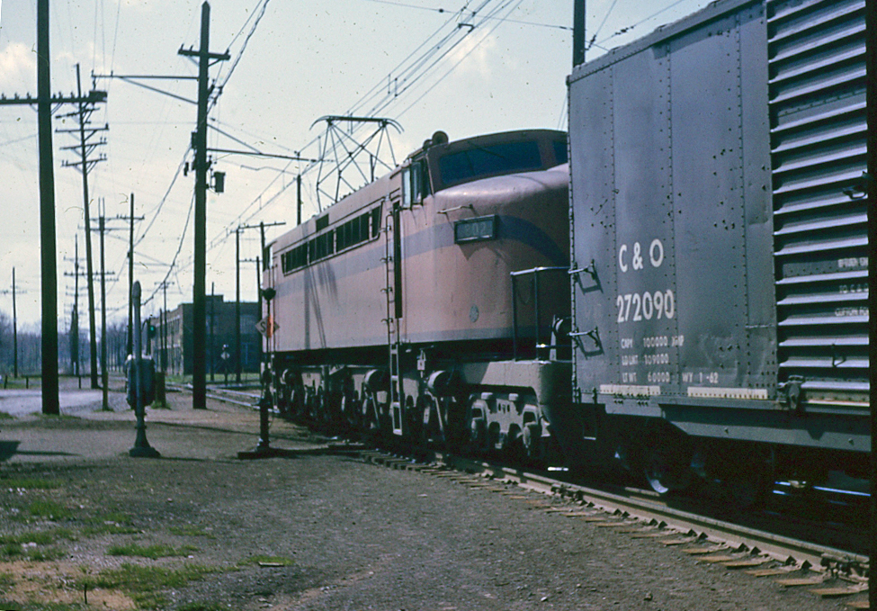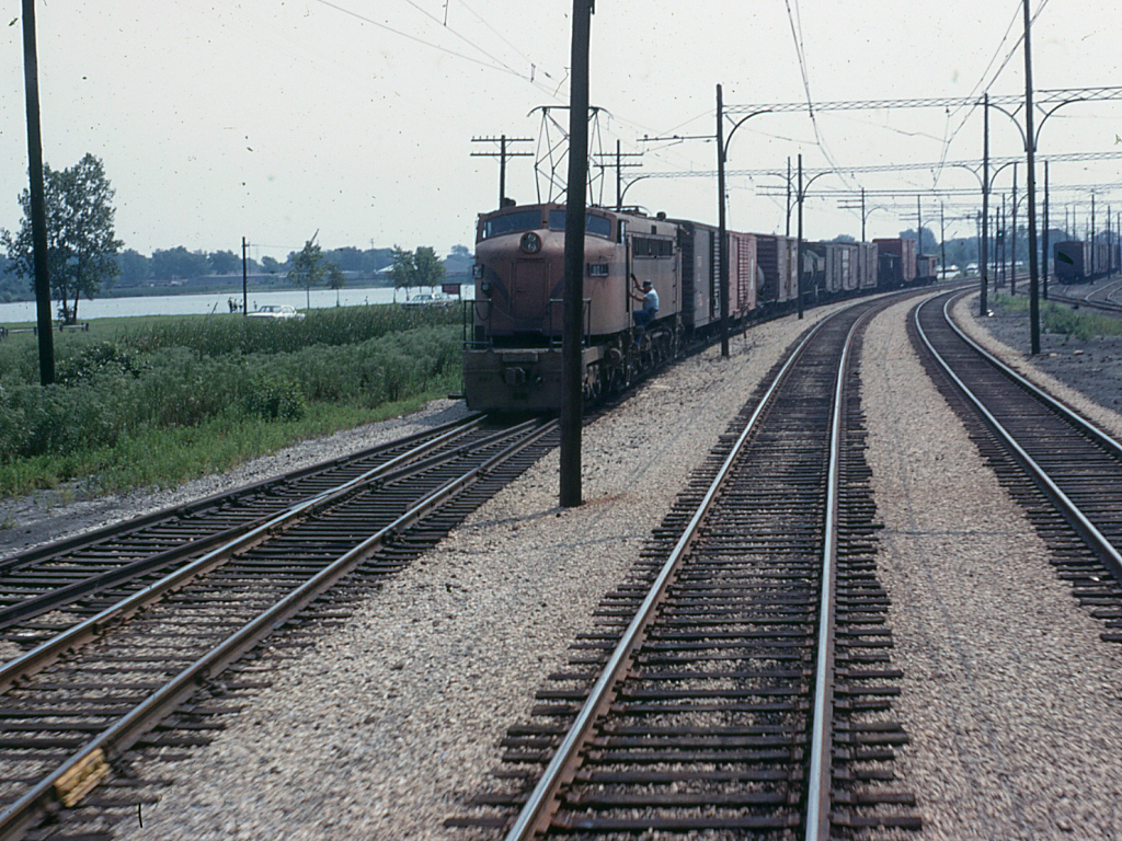 | This view was taken of a west bound freight at the shops in Michigan City, IN, April 19, 1963. |