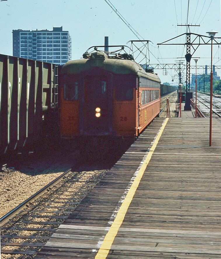 | Here we see #28 northbound at the 57th Street Station in south Chicago, the station for the Museum of Science & Industry, May 27, 1977. | ![]() |