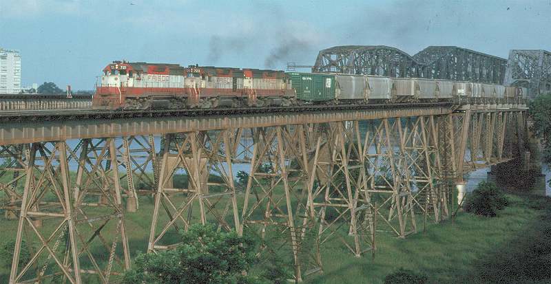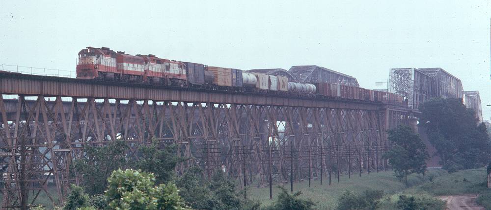 | SLSF EMD GP35 #712 is west bound on the Mississippi River bridge in Memphis. |