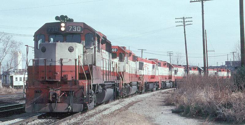 | SLSF EMD GP35 #730 is rounding the curve at Kansas Ave. in Memphis. |