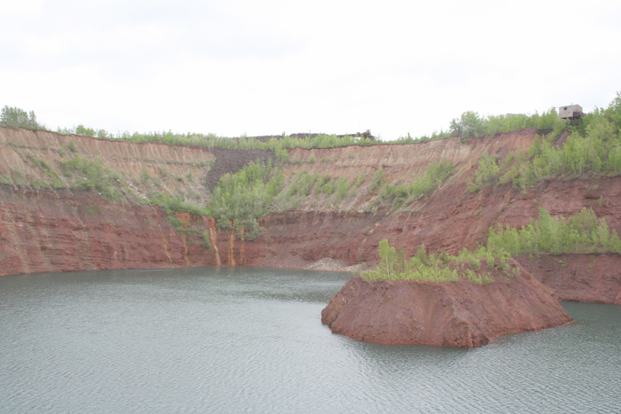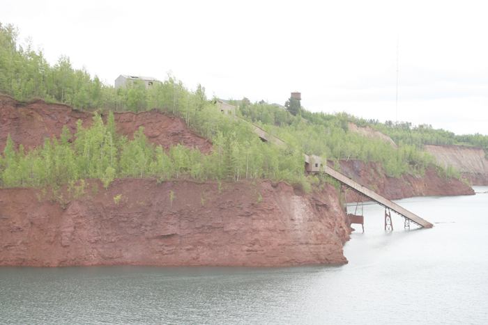 The Hill Annex Mine is flooded to a depth of 300 ft. The conveyor that was once used to move the ore from the pit to the top of the mine is now submerged. |