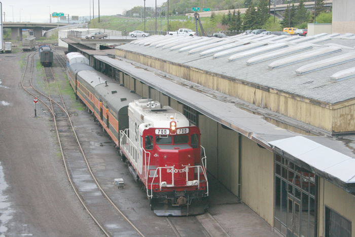 An excursion train is seen backing out of the Lake Superior Museum of Transportation. |
