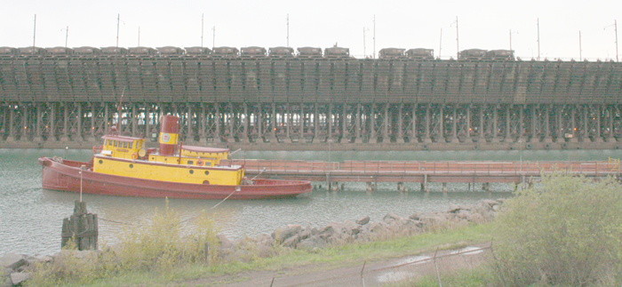 | Note the steam rising from the hot taconite pellets in the ore cars in Proctor yard. |